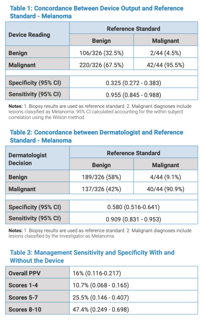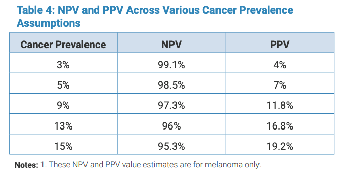 For prevalence assumptions like those seen in general dermatology practice, the predicted NPV of the device is 97.3% with a PPV of 11.8% (Table 4).